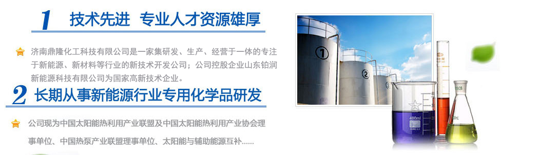 濟南鼎隆化工科技有限公司是一家集研發、生產、經營于一體的專注于新能源、新材料等行業的新技術開發公司;公司控股企業山東鉑潤新能源科技有限公司為國家高新技術企業。擁有雄厚的科研實力和專業銷售隊伍以及多名從事化學化工專業的高素質人員,其中博士生導師1人,碩士研究生3人。公司現為中國太陽能熱利用產業聯盟及中國太陽能熱利用產業協會理事單位、中國熱泵產業聯盟理事單位、山東清潔能源供暖產業聯盟理事單位、太陽能與輔助能源互補供熱/制冷工程專業委員會會員單位。公司專注于綠色科技,專業化研發環境友好型化工產品,與眾多高校和國內外多家著名化學品公司保持戰略合作關系。公司擁有“載能”和“澤能”...更多